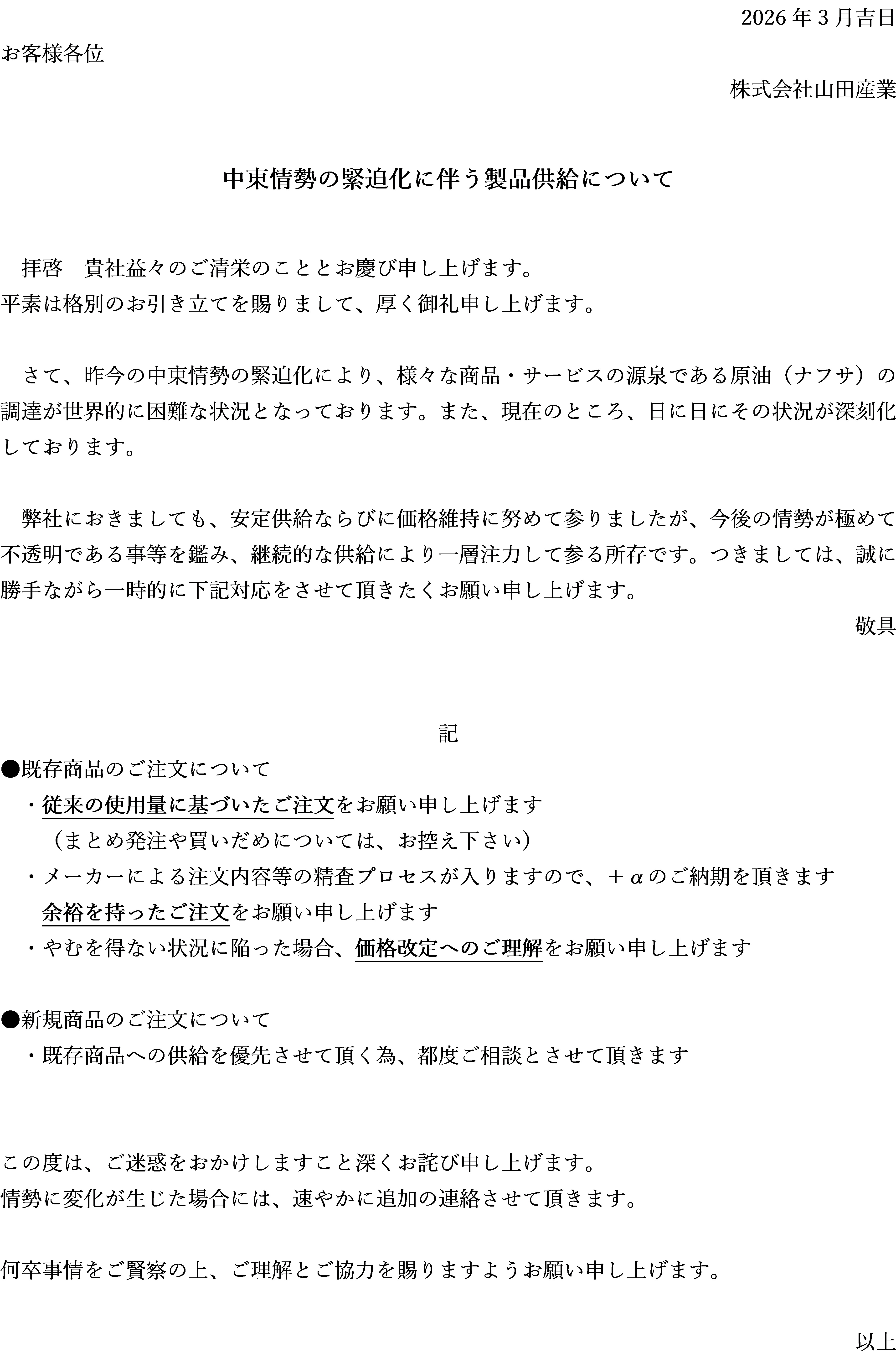 昨今の中東情勢に伴う製品供給につきまして、ご案内をさせて頂きます。
